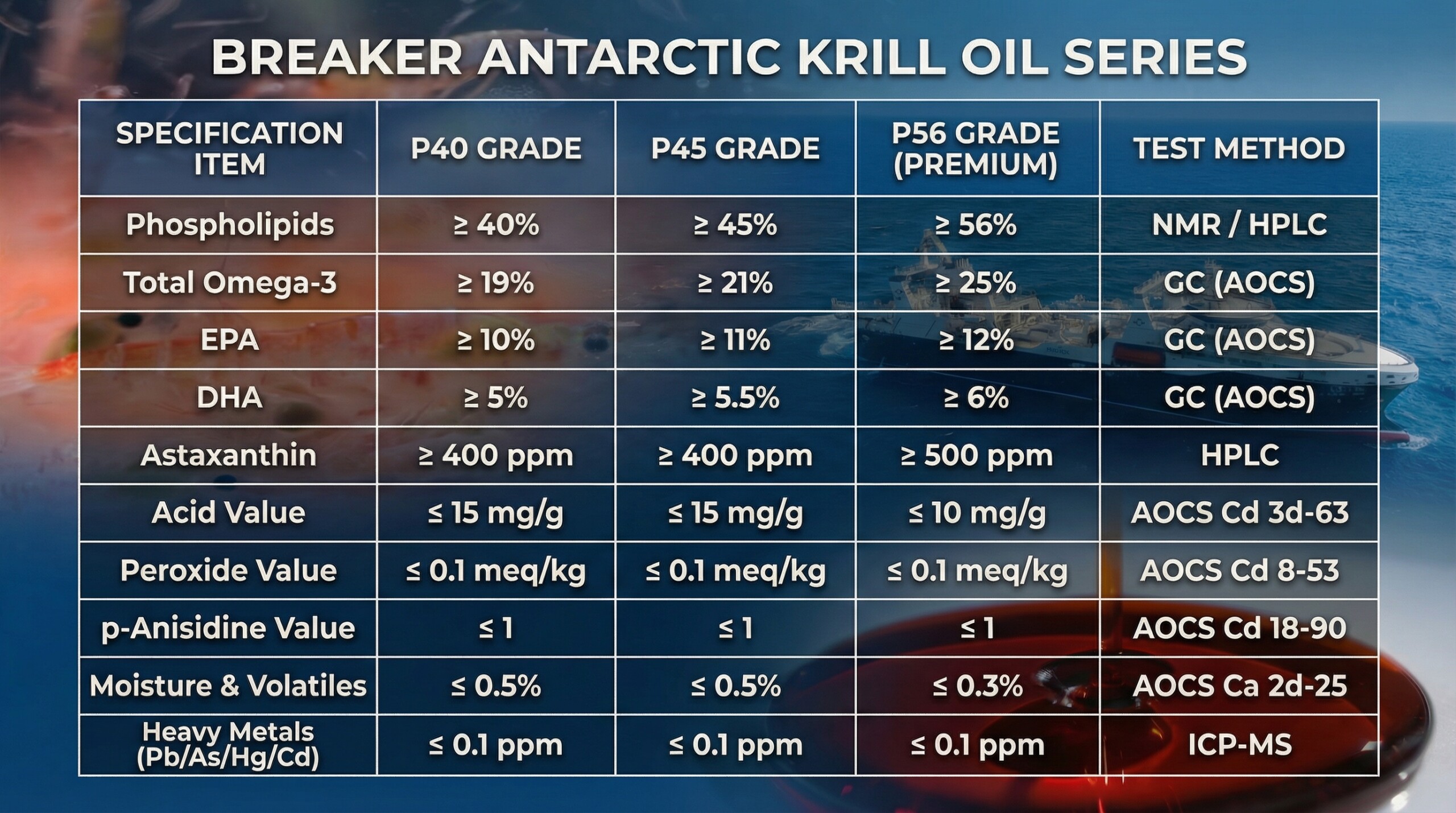 According to China’s aquaculture industry standards, krill oil with a phospholipid content of ≥45g/100g is considered high quality. In BREAKER’s product standards, premium specifications set phospholipid content above 56g/100g, with the following product series available: